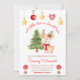 This cute and festive watercolor baby shower invitation features an adorable reindeer in a red scarf with hanging ornaments and lollipops. This is perfect for a Christmas themed baby shower.