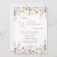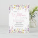 An elegant whimsical baby girl shower invitation featuring "a little wildflower is on her way" written in a mixture of modern grey typography and a stylish pink script, and boho-inspired watercolors of dainty purple, pink and yellow wildflowers. Personalize the mother's name and shower details in simple grey and pink lettering.