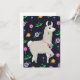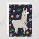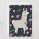 Una llama esponjosa, envuelta en un collarín de hilados vibrante, posa contra un fondo anónimo y profundo adornado con un patrón de flores animadas en tonos naranja, rosa, azul y verde. Obra original de Noël Snow.