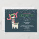 Una invitación de fiesta para navidades con un diseño caprichoso. Una llama linda con gafas de sol negras, un sombrero de santa roja y una bufanda de invierno festiva. También usando una manta y pompones al estilo sudamericano. La palabra "Alegría" escrita encima de su cabeza con una fuente festiva y colorida. Nieve cayendo desde arriba. Se coloca sobre un fondo azul oscuro.