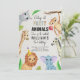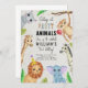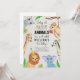 Llamar a todos los animales Fiestas Invitación Safari Esta tierna invitación incluye animales fiestas como jirafa, mono, cebra, elefante, león y rinoceronte. El texto dice "¡Llamando a todos los animales fiestas " con la palabra "FIESTA" con estampado animal!
