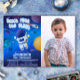 Despegue su cumpleaños con esta invitación fuera de este mundo. Todos los elementos y el fondo son diseños originales y dibujados digitalmente para capturar la atmósfera de un viaje espacial interestelar.
