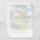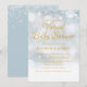Suaves copos de nieve caen sobre tu baby shower virtual, detalles de lluvia de regalos o shower de parejas, en tipografía dorada elegante sobre un fondo mágico de invierno. Diseñado por Thisisnotme©