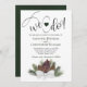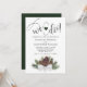 Esta hermosa invitación a la boda presenta un diseño rústico con un cúmulo de pinares y ramas de pino atadas con un arco de satén blanco. El encabezamiento está escrito con elegantes letras de guiones y dice: ¡Lo hacemos! con un corazón lindo entre las camadas. La parte trasera es de un color verde profundo del bosque. Romántico, caprichoso y elegante, esta invitación es perfecta para un boda con temática invernal, al aire libre o vacacional.