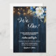 Una elegante Invitación a la Boda con elegante caligrafía completada por una maravillosa madera azul, luces de cuerda de jardín y floral azul blanco con purpurina dorado. Puede personalizar esta tarjeta con los detalles de su Boda.