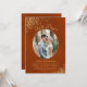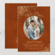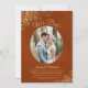 Esta hermosa invitación para la recepción de la boda o la fiesta posterior presenta un elegante título en letra cursiva que dice "¡Lo hicimos!". Tiene un diseño simple pero elegante con letras doradas en letra cursiva sobre un fondo de color naranja oxidado marmolado o marrón quemado, y tu foto en un marco ovalado rodeado de volantes de encaje de papel de aluminio falso. Perfecto para escapadas o celebraciones que tienen lugar después de una ceremonia privada. Una excelente manera de invitar a su familia y amigos a celebrar su amor.
