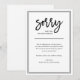 Este anuncio simple y elegante, en blanco y negro, es una forma de disculparse con los clientes o amigos cuando se debe cancelar, reprogramar o posponer un evento o boda. La moderna caligrafía negra agrega un toque elegante, mientras que el marco rectangular negro agrega un aspecto formal y clásico. Utilice estas tarjetas de anuncio para cualquier cancelación, aplazamiento o reprogramación.