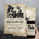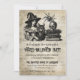 Invitación gótica a la fiesta de Halloween al estilo vintage con una bella bruja con su lobo, una araña y un cráneo en libros antiguos para darle un ambiente espeluznante. Textura de papel antiguo y texto de estilo antiguo.