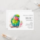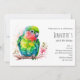 Invitación de cumpleaños con una ilustración de loro adorable. Un pequeño loro verde con colores azul y amarillo mezclándose. El cuello tiene un tono vibrante de rosa rojizo.