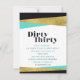 Moderna invitación de cumpleaños número 30. La tarjeta dice: Sucio Treinta. Los colores principales de la invitación son el agua, el negro y el oro. También tiene algunos preciosos detalles tipográficos.