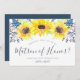 La carta de presentación de la fiesta de novias floral rústica incluye un borde superior de girasoles color amarillo y capullos de flores silvestres azul marino. Personaliza con tus detalles de la solicitud de honor de tu matrona (mostrada con "¿serás mi matrona de honor? No puedo decir que lo haga sin ti") en escritura con letras a mano moderna y letras serif tradicionales. Las invitaciones se invitan al azul del puerto rico.