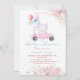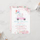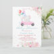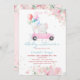 Única invitación a la ducha de bebé chica que conduce por carretera con un auto de color rosa con globos y flores.
