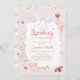 A soft and elegant baby shower invitation featuring blush pink florals, delicate greenery, charming ladybugs, and a graceful bow. The gentle pastel color palette and romantic garden style make this design perfect for a baby girl shower. Matching items available.
