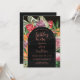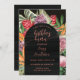 Flores tropicales y follaje rodean una puerta abovedada para divertirse. Colores de abundante vegetación con flores naranjas y rosas crean un ambiente emocionante para la celebración de un evento de cumpleaños. La letra está en un color de guayaba, reversa y arco es una textura de acuarela de carbón. Personaliza todo el texto.