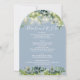 Esta elegante invitación de boda con luces de cadena botánicas de eucalipto verde y azul polvoriento puede ser personalizada con su información en tipografía chic con toda la información de su día especial de boda en el reverso, incluyendo su RSVP, alojamiento y detalles adicionales. Diseñado por Thisisnotme