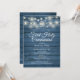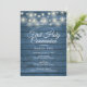 Una invitación rústica para la primera comunión con bonitas luces de cadena y tus datos personalizados especiales en tipografía chic sobre un fondo de paneles de madera azules. Diseñado por Thisisnotme©