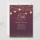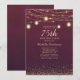 Moderna, elegante y chic invitación formal de cumpleaños número 75 en color burdeos para mujeres con brillo dorado y luces de cuerda. Personaliza con tu propio texto.