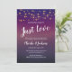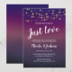 Esta hermosa y audaz invitación de boda y huida será la forma perfecta de invitar a amigos y familiares a una fiesta de recepción. Este diseño presenta un fondo morado, luces de cadena elegantes y texto blanco en fuentes manuscritas y de bloque. ¡Haz una declaración con esta invitación!