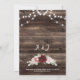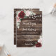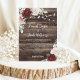 Permita que sus huéspedes sientan el encanto rústico de su boda con esta invitación de boda floral rosa y borgoña. El fondo tiene un estilo de madera de pino con luces de cuerda y un ramo de rosas y eucaliptos que le confieren un encanto campestre a la invitación. Esta dulce y romántica invitación es perfecta para un boda rústico al aire libre y dejará a sus seres queridos ansiosos por unirse a usted para su día especial.