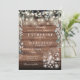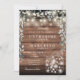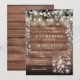 Lindas luces de cadena, tarros de mason y una cascada de exuberante vegetación floral hermosa enmarca los detalles de la celebración de su boda especial en una elegante tipografía sobre un fondo de madera rústica. Diseñado por Thisisnotme