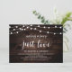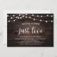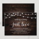 Hermoso Nada de Lujo, Solo Amor, Tarjeta de invitación para boda y anuncio de elopamiento, con diseño rústico moderno, Luces de cadena de granja, tema de papel marrón de madera. Esto es perfecto para la recepción de su boda y la fiesta de celebración después de la boda. Agregue sus detalles en la fuente / letra coincidente.