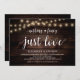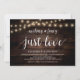 Hermoso Nada Lujoso, Solo Amor, Tarjeta de invitación para anuncio de boda / fiesta de elopamiento, con diseño rústico moderno, Luces de cadena de granja, tema de papel marrón de madera. Esto es perfecto para la recepción de su boda y la fiesta de celebración después de la boda. Agregue sus detalles en la fuente / letra coincidente.