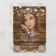 Diseño rústico y hermoso con cadenas de luces brillantes sobre madera y hermosos acentos de encaje falso en las esquinas para esta invitación de fiesta con plantilla de foto única