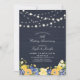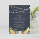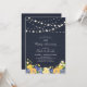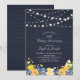 Celebra un día especial con esta invitación de aniversario de boda rústica de madera y flores. Este diseño presenta luces de cadena elegantes y un ramo de flores sobre un fondo de textura de madera azul oscuro. Puedes personalizar el texto y las fuentes como desees. Más invitaciones y suministros para fiestas a juego están disponibles en mi tienda BaraBomDesign.