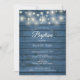 Una invitación de bautizo rústica que presenta hermosas luces de cadenas y tus detalles personalizados especiales en tipografía chic sobre un fondo de paneles de madera azules. Diseñado por Thisisnotme