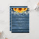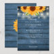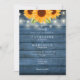 Lindas luces de cadenas y girasoles decoran los detalles de la celebración de su boda especial en elegante tipografía sobre un fondo de madera rústica azul. El reverso presenta sus iniciales de monograma dentro de un girasol a juego. Diseñado por Thisisnotme
