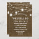 Invitaciones de renovación de votos de aniversario con luces de frasco de albañil rústicas, estilo shabby, fondo con aspecto de arpillera vieja y rústica. La parte superior está adornada con faroles de frasco de albañil vintage y luces de cadena románticas para exteriores. Dice 'We Still Do' en letra de estilo western con 'Vow Renewal' debajo y el año de aniversario arriba en letra curva. Los detalles de la fiesta de aniversario, incluida la información de RSVP, están abajo. La parte trasera tiene faroles y fondo con aspecto de arpillera coincidentes. Nota: Todas las imágenes se imprimen. Utilice el botón Personalizar para cambiar cualquier cosa: estilos de fuente, tamaños, colores o ubicación. Invitaciones chic de campo para fiesta de aniversario rústica al aire libre, tema de boda de granero y estilos de aniversario de boda western o vintage