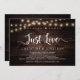 Nada Lujoso, Solo Amor de fiesta, Tarjeta de anuncio / invitación de boda de escapada, en madera oscura rústica moderna, diseño de luces de cadenas. Esto es perfecto para la recepción de su boda y la fiesta de celebración después de la boda. Agregue sus detalles en la fuente / letra coincidente. #TeeshaDerrick