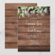 Una invitación de boda de jardín campestre chic que presenta hermosas luces de cuerda y hojas frescas de eucalipto de follaje verde natural, enmarcando los detalles de su boda en escritura elegante y tipografía clásica sobre un fondo de madera rústica. Diseñado por Thisisnotme©