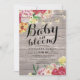 Tarjetas de Invitación para Fiesta de Bebé de 'Bebé en Flor' - Plantillas - Fondo de Textura de Madera Rústica con Flores de Acuarela Vintage y Luces de Cuerda Elegantes.