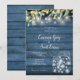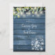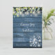 Una invitación de boda de jardín campestre chic que incluye bonitas luces de cuerda, frascos de mason y hojas frescas naturales de eucalipto, enmarcando los detalles de su boda en escritura elegante y tipografía clásica sobre un fondo de madera rústica azul. Diseñado por Thisisnotme