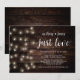 Hermoso Sin Adornos, Solo Amor, Boda Anuncio de Huida de Novios / Tarjeta de Invitación a la Fiesta, con Luces de Cuerda de Granja Rústica Modernas, tema de papel marrón de madera. Esto es perfecto para la recepción de su boda y la fiesta de celebración después de la boda. Agregue sus detalles en fuente / letra coincidente.