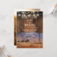 Esta invitación de boda de madera de granero occidental rústica con una escena de montaña de rancho occidental y luces de cuerda en un fondo de madera de granero se puede personalizar con su información en tipografía elegante y foto especial en el reverso. Diseñado por Thisisnotme©