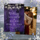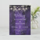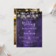 Esta invitación de boda con luces de cuerda de madera de granero rústico morado se puede personalizar con su información en tipografía moderna y una foto especial en el reverso. Diseñado por Thisisnotme©