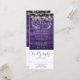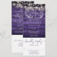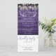 Una invitación de boda todo en uno que presenta hermosas luces de cuerda y tipografía elegante sobre un fondo de madera morada rústica. La invitación incluye una tarjeta de RSVP que se puede cortar y detalles de información para los invitados. Diseñado por Thisisnotme©