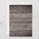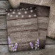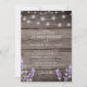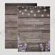 Invitación de boda con impresión de madera rústica y luces de cuerda lavanda y blanca.