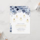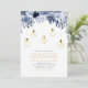 Invite a tus invitados a tu día de celebración especial con esta hermosa invitación a la fiesta de compromiso. Este diseño sofisticado cuenta con hermosas flores de tono azul y luces de cuerda doradas con accesorios de iluminación geométricos. Puedes personalizar el texto y el color de fondo. Invitación perfecta para una fiesta de compromiso de invierno moderna.
