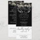 Una invitación de boda todo en uno que presenta bonitas luces de cuerda y tipografía elegante sobre un fondo negro. La invitación incluye una tarjeta de RSVP que se puede cortar y detalles de información para los invitados. Diseñado por Thisisnotme©
