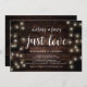 Hermoso Sin Adornos, Solo Amor, Tarjeta de Anuncio de Boda Fugaz / Invitación a la fiesta, con diseño Rústico Moderno, Luces de Cuerda de Granja, tema de papel marrón de madera. Esto es perfecto para la recepción de su boda y la fiesta de celebración después de la boda. Agregue sus detalles en la fuente / letra coincidente.