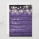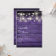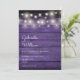Una elegante invitación de boda rústica con hermosas luces de cuerda sobre los nombres de la feliz pareja en una elegante letra cursiva sobre los detalles especiales de la boda en un fondo de madera morada rústica. El reverso presenta un fondo de madera rústica a juego. Diseñado por Thisisnotme©