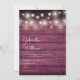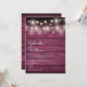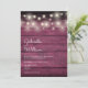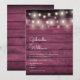Una elegante invitación de boda rústica con hermosas luces de cuerda sobre los nombres de la feliz pareja en una elegante letra cursiva sobre los detalles especiales de la boda en un fondo de madera rústica de color rojo burgundy. La parte posterior tiene un fondo de madera rústica a juego. Diseñado por Thisisnotme©