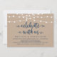 Preciosas Luces de Cuerda Rústicas Modernas de Granja, Fuente de letra azul marino en fondo de papel Kraft, Anuncio de boda y fuga, Tarjeta de invitación para celebración de fiesta (Celebra con nosotros). Esto es perfecto para la recepción de su boda y la fiesta de celebración posterior a la boda. Agregue sus detalles en la fuente / letra coincidente.