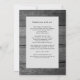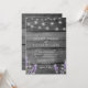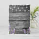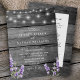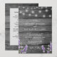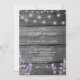 Invitación de boda con impresión de madera rústica y luces de cuerda lavanda y blancas con detalles en la parte posterior.