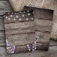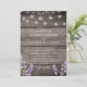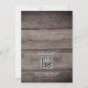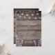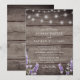 Invitación de boda con impresión de madera rústica con luces de cuerda lavanda y blanca con código QR en la parte trasera para responder.