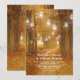 Invitaciones de boda de bosque otoñal con un rústico bosque otoñal con árboles cubiertos de hojas rojas, naranjas y amarillas, un corazón tallado con sus iniciales, luces de masonita con luces centelleantes y una plantilla de texto de boda moderna.