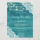 Las cosas cambian. Envíe a sus invitados una hermosa invitación de cambio de fecha de boda debido a esta invitación de luces de cuerda con encaje y madera azul. Ideal para bodas campestres y al aire libre.